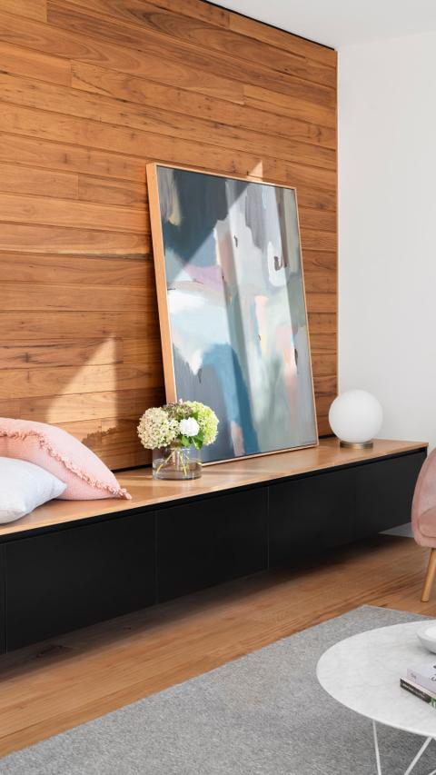 De ruimte is omringd door stijlvolle meubels die een warme sfeer creëren. Met aandacht voor detail biedt het ontwerp echte functionaliteit.